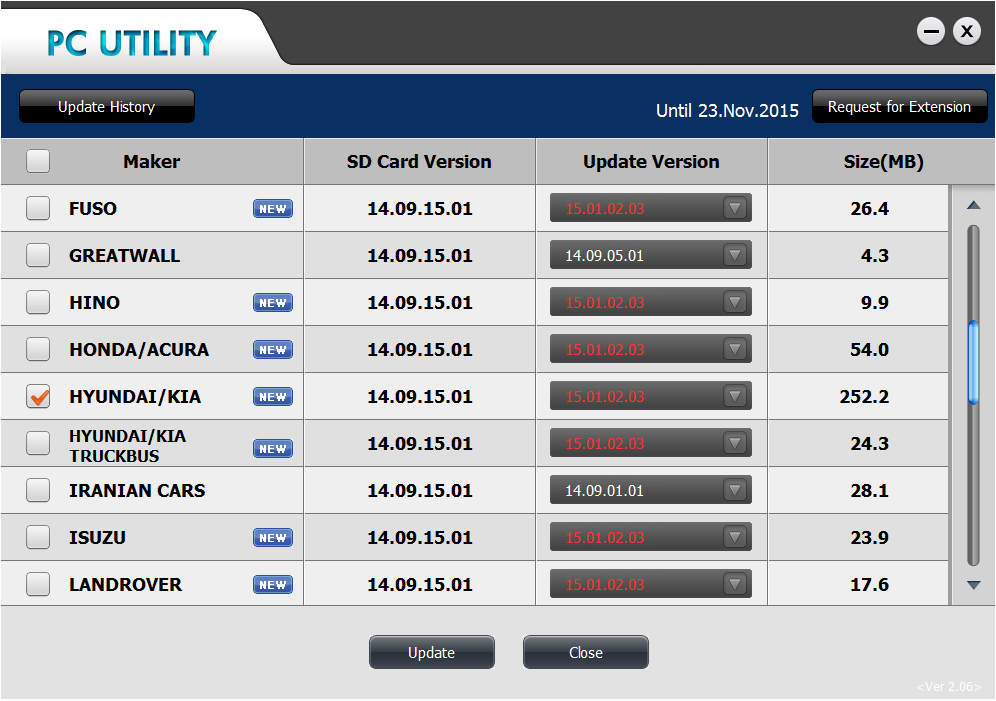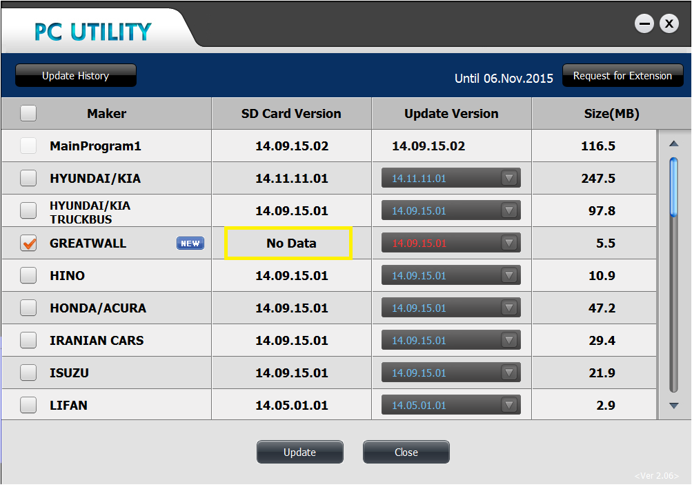In this January 2015 update, among other brands’ updated software, we would like to emphasize that Korean domestic version of Hyundai and Kia software will be included in G-scan. Until now, Korean domestic version of Hyundai and Kia software was supported by only G-scan2. However, as a result of January 2015 update, Korean domestic version of Hyundai and Kia software will be added to G-scan as well. It could be good news for most G-scan users, but at the same time, this might lead some customers into dilemma. For customers who purchased G-scan prior to 2013, their SD card’s memory was 2 GB, instead of 4 GB which has been provided as a part of G-scan after 2013. From this January 2015 update, when customers with 2 GB SD card try to update general version of software, excluding Iran, Spain, USA, and Australia, they will encounter a notification on their PC Utility screen if they select all software updates. Notification would be following: